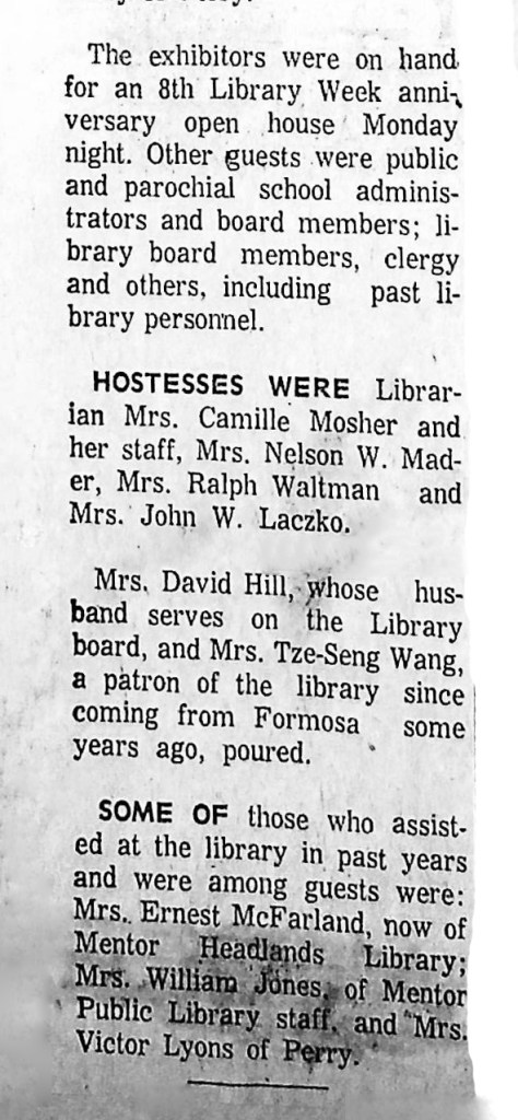 for former staff – pictured are library patron Mrs. Tze-Seng Wang, Mrs. William Jones, Mrs. Ernest Mc Farland, Mrs. Victor Lyons, and Librarian, Mrs. Camille Mosher (full article to the right)