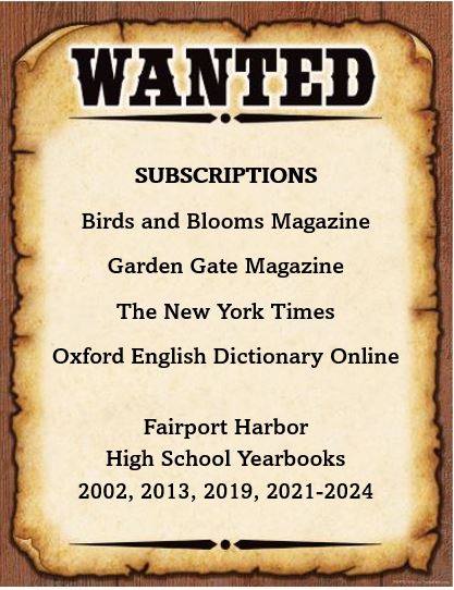 The Friends of the Library are currently not accepting donations of materials for the book sale but we may have specific books we need. Check out our want list.