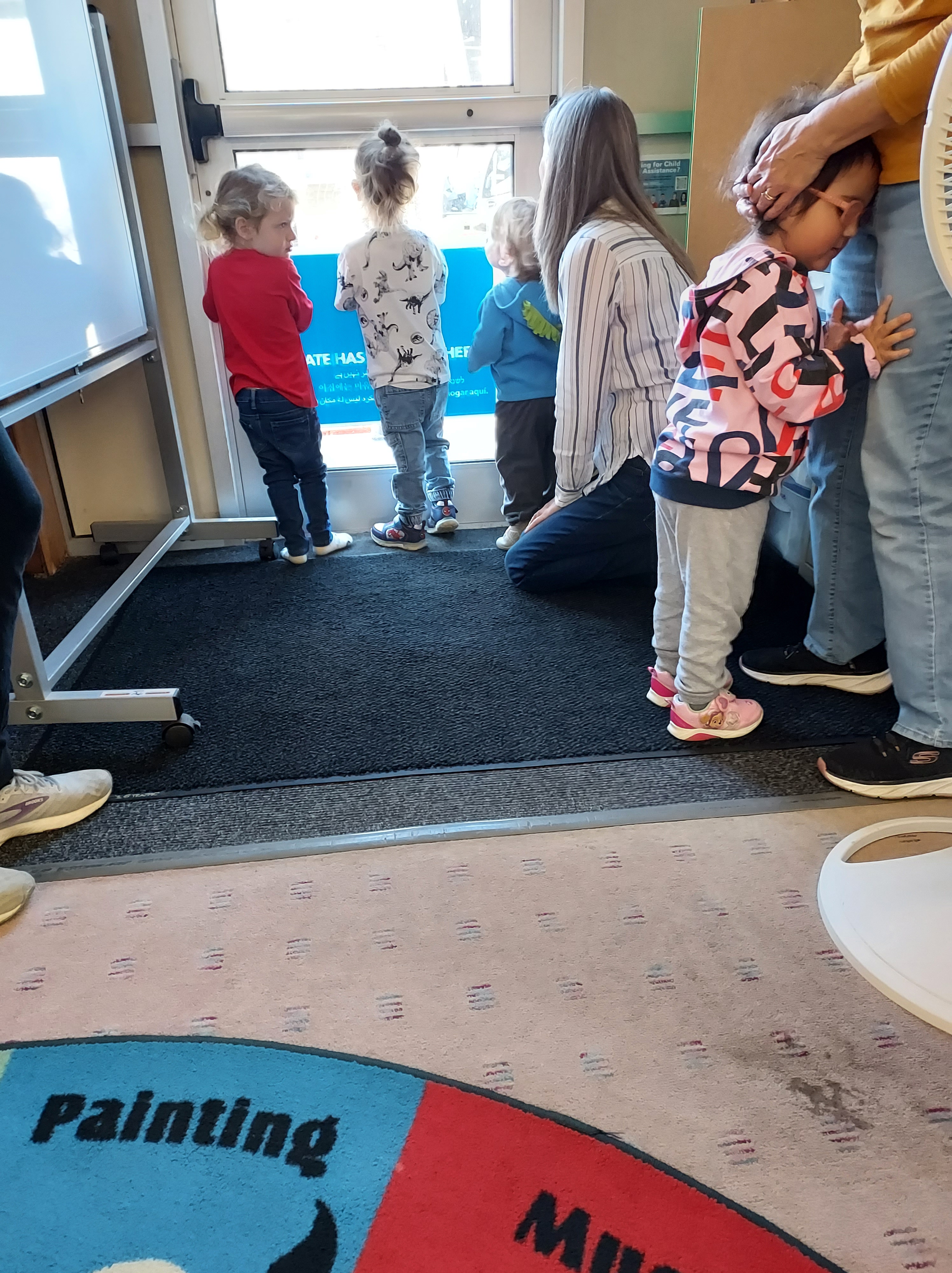 Young library visitors and Miss Laura look at the library construction during story hour.